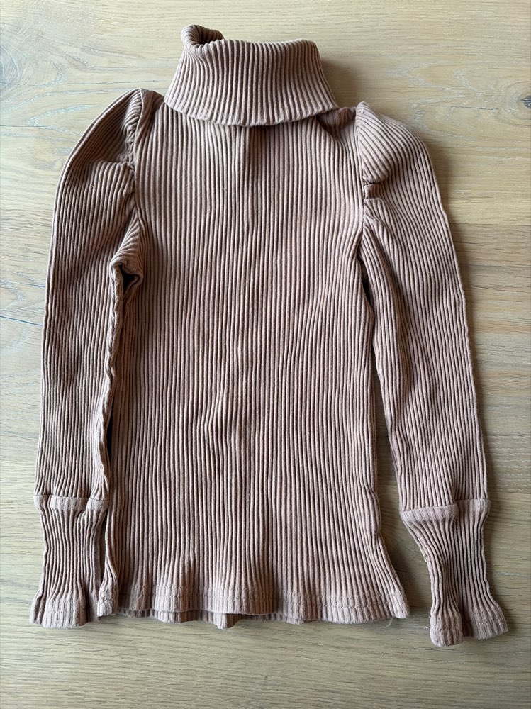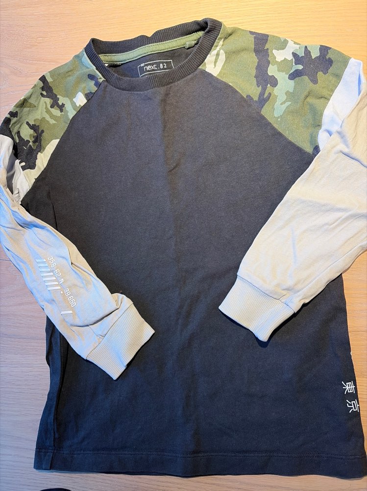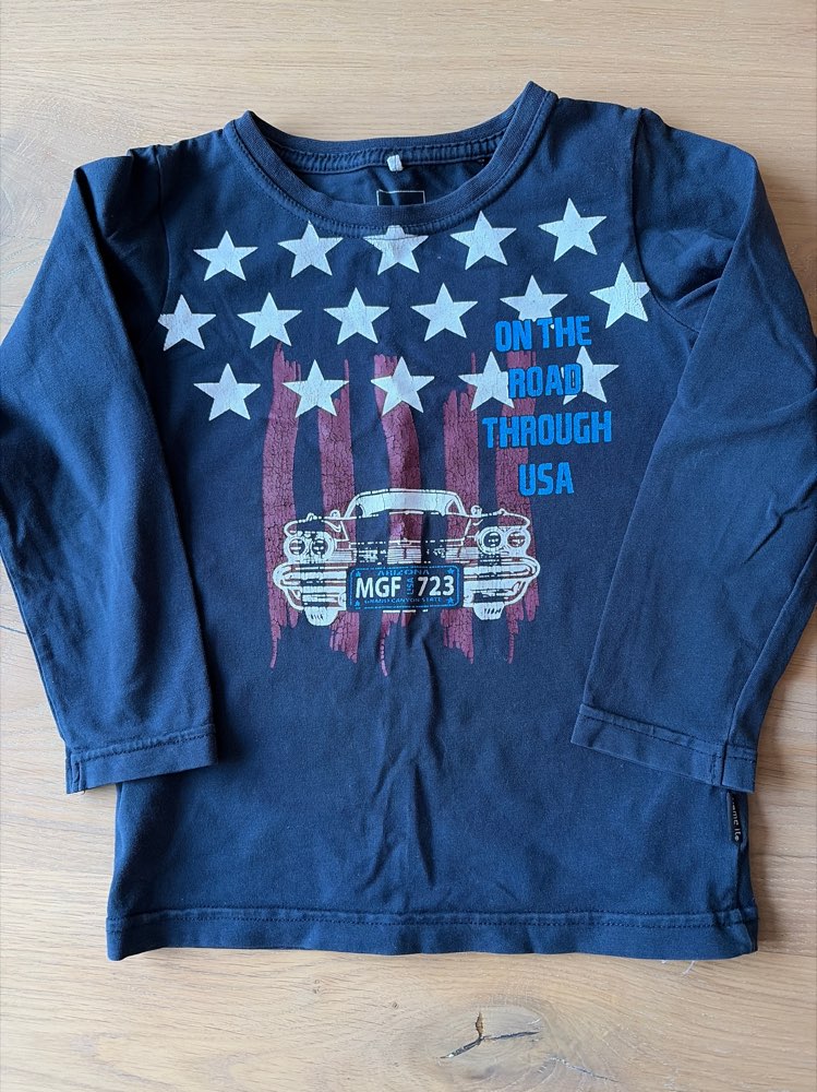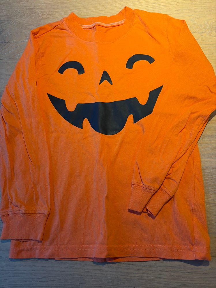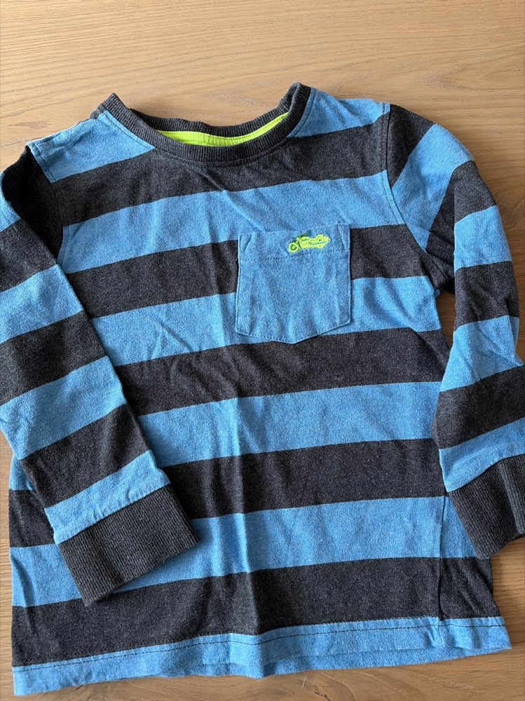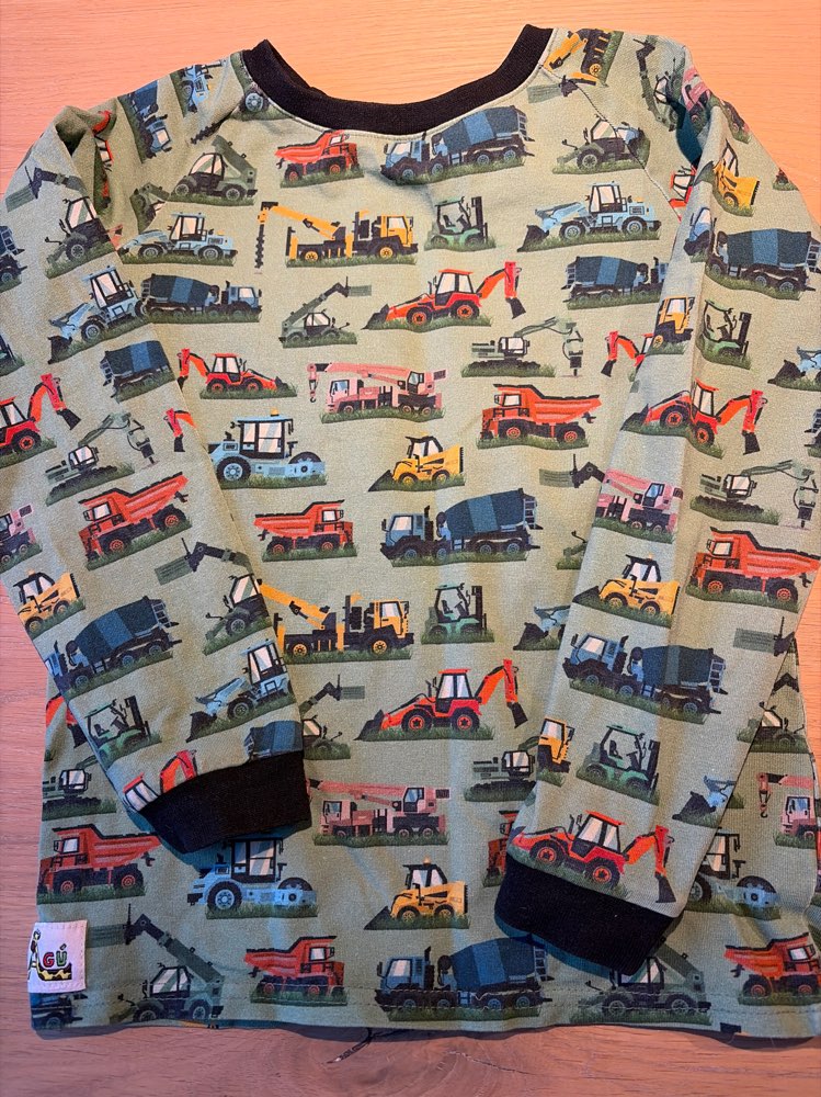 Heitir stærð 116 en er í raun 110. Smá hnökruð en fín sem leikskóla peysa.
